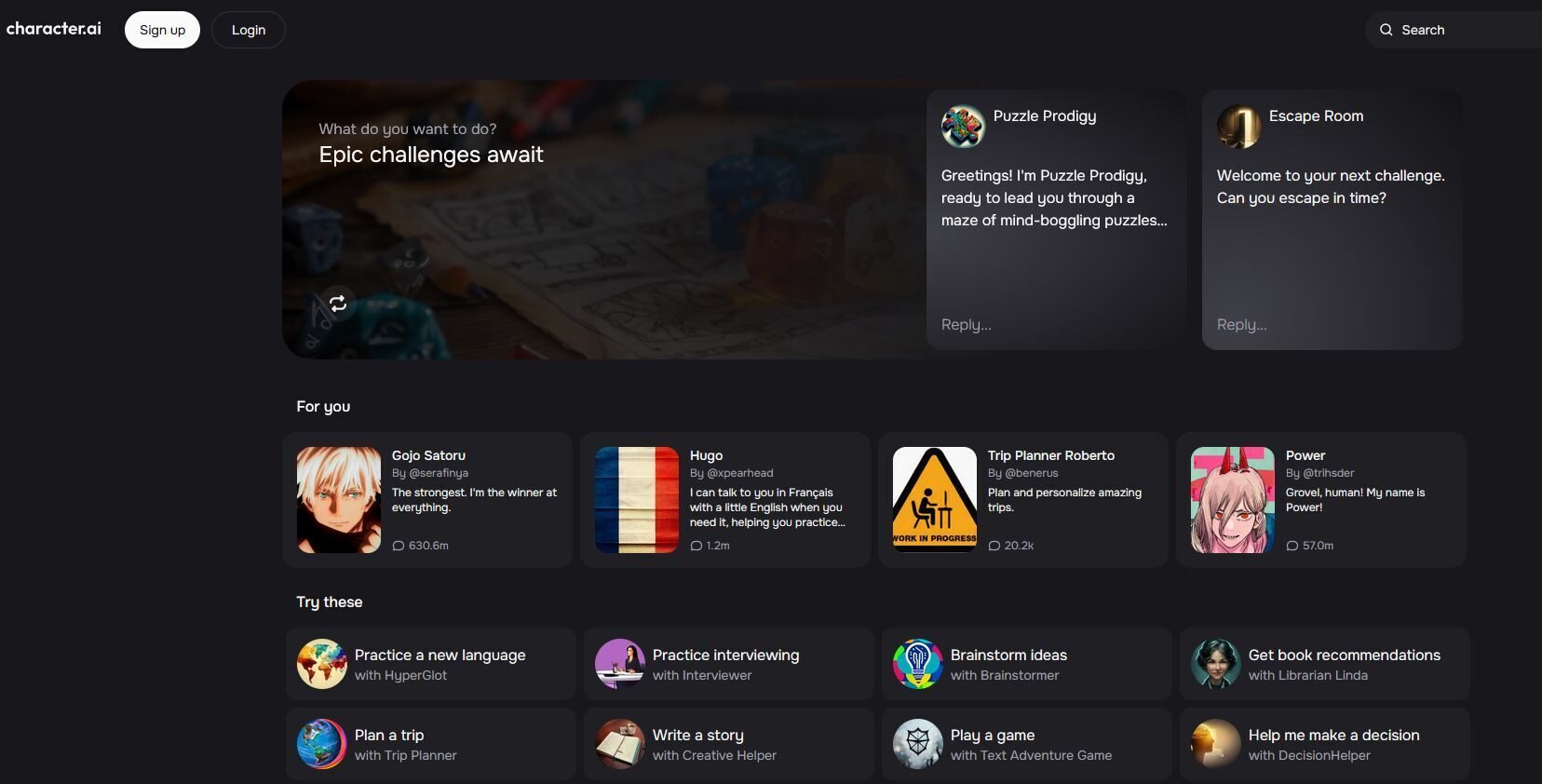 Για παράδειγμα, αν θέλετε να εξασκηθείτε σε ερωτήσεις συνέντευξης, να δημιουργήσετε ιδέες, να μάθετε μια νέα γλώσσα, να οργανώσετε διακοπές ή να παίξετε ένα παιχνίδι στο διαδίκτυο, υπάρχει ένα chatbot γι’ αυτό. Μπορείτε να βρείτε αρκετούς από τους δημοφιλείς προκατασκευασμένους χαρακτήρες που επισημαίνονται στην αρχική σελίδα του ιστότοπου.