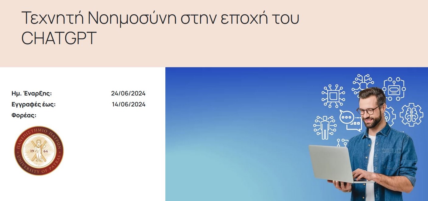 Το πρώτο ελληνικό και ευρωπαϊκό πανεπιστημιακό πρόγραμμα αφιερωμένο στο ChatGPT, το Πανεπιστήμιο Πατρών ανακοινώνει την έναρξη ενός νέου 4μηνου εκπαιδευτικού μαθήματος (e-learning) για την Τεχνητή Νοημοσύνη, ένα πλήρες («hands-on») πρακτικό και θεωρητικό. εκπαίδευση. Εργαλεία για πραγματικά προβλήματα και αντιμετώπιση προβλημάτων σε εφαρμογές και τεχνολογίες τεχνητής νοημοσύνης.