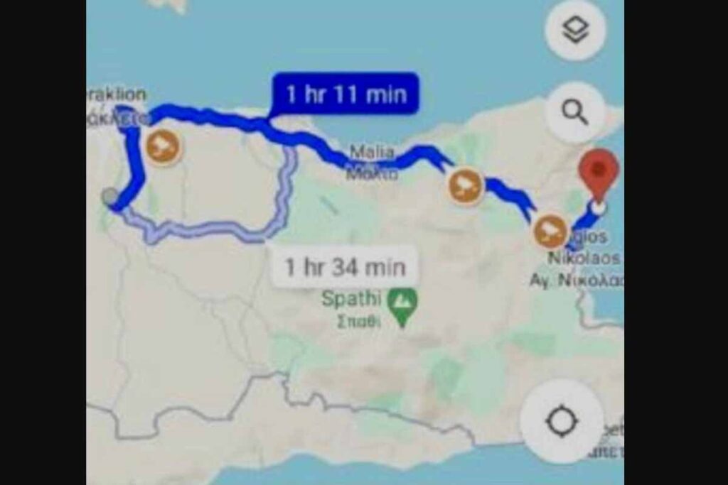 Ένας χάρτης που εμφανίζει ειδοποιήσεις πυρκαγιάς σε μια συγκεκριμένη διαδρομή στην Κρήτη παρέχεται ως παράδειγμα.